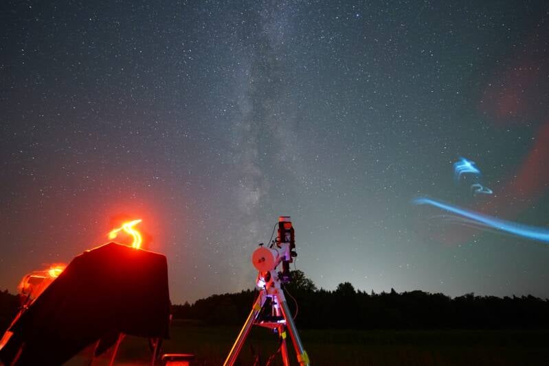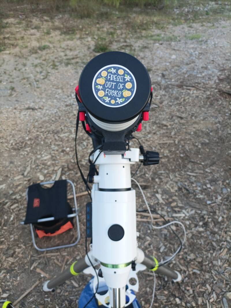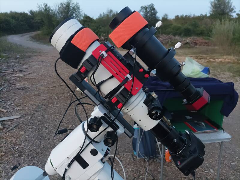 V temi sva hitro postavila opremo; jaz svojega Heq 5 Pro in malega Dwarfa 2, ter Gregor svojega Star Adventurer GTi. Dokaj hitro sva polarno nastavila teleskope, ter začela z zajemom fotonov. Noč je bila jasna, pogoji skoraj odlični, Luna je bila osvetljena skoraj 40%, a je ob 23:50 zašla.