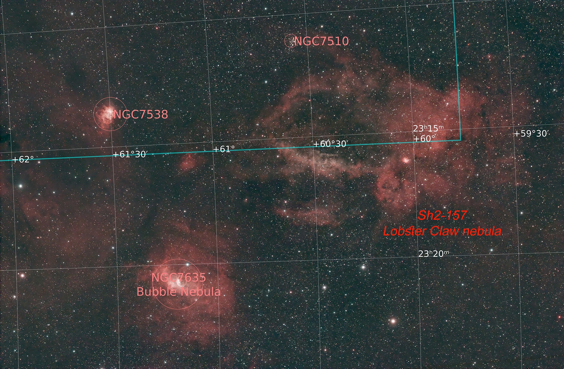 Sh2-157: Sharpless 157, znana tudi kot meglica Jastogov krempelj, je svetla emisijska meglica v ozvezdju Kasiopeja. Leži južno od bolj znane meglice Mehurček (NGC 7635). Na tej sliki je tudi nekaj drugih predmetov. Planetarna meglica PLN 110-0,1 se nahaja blizu središča zgornjega desnega kvadranta. Svetla meglica blizu središča slike je Lynova svetla meglica 537 (LBN537), znana tudi kot Sharpless 157a. Majhna kopica zvezd tik nad spodnjo kleščo je Markarian 50, svetla kopica zvezd nad zgornjo kleščo pa je odprta kopica NGC 7510.