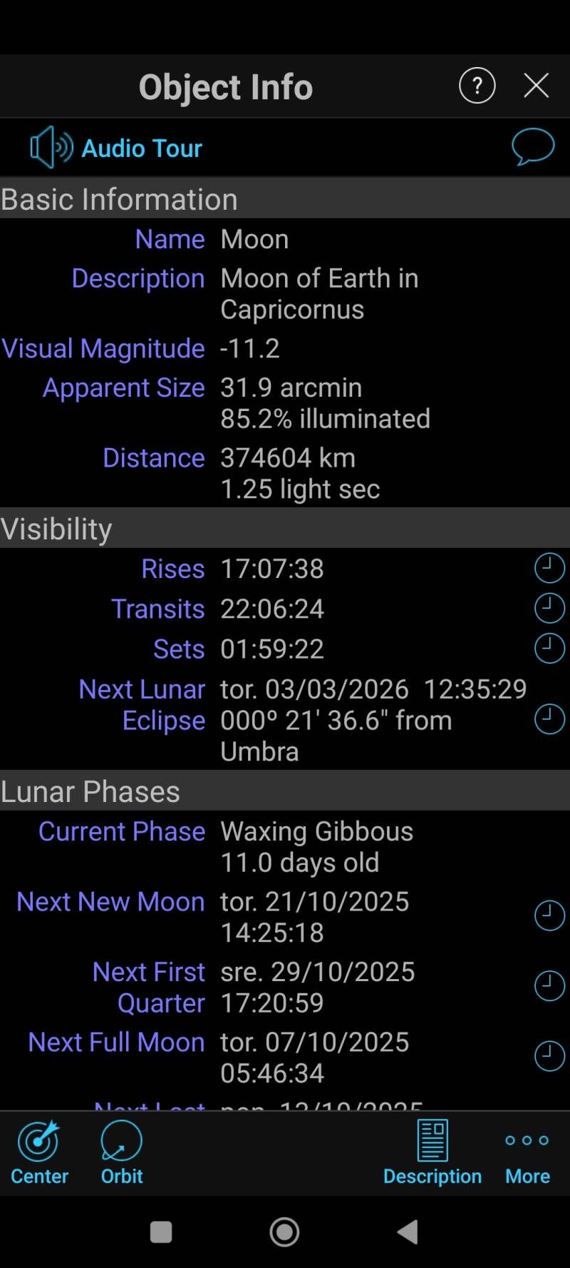 - 03.10.2025: Vzhod ob 17:07, osvetljenost 85%, oddaljenost cca. 375512 kilometrov oz. 1.25 svetlobne sekunde. Zahod ob 1:59.