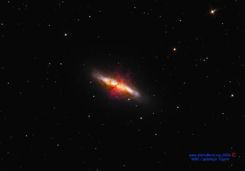 Messier 82 (M82), pogosto imenovana tudi “galaksija Cigara”, je ena najbolj zanimivih in dinamičnih galaksij, ki jih lahko opazujemo in fotografiramo. Gre za pravi laboratorij za razumevanje nastajanja zvezd in galaktičnih “eksplozij”.